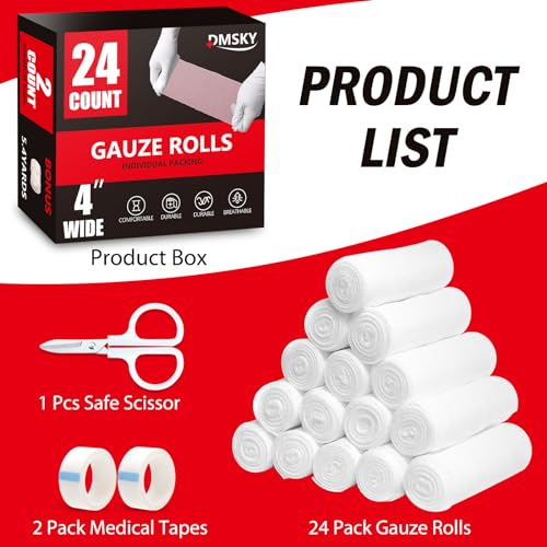 24 Pack Gauze Rolls Bandages, 4 in x 4.1 Yards, Individually Wrapped Breathable Rolled Gauze, Premium First Aid Supplies & Medical Supplies for Wounds