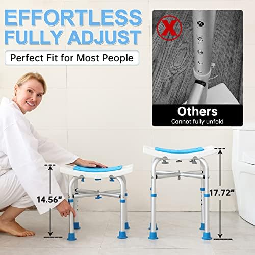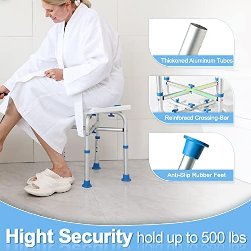 【500LB HEAVY-DUTY SHOWER CHAIR】Stay safe and comfortable during your shower with our heavy-duty shower chair. Thanks to the reinforced cross-braces and engineering-grade design, this sturdy stool can support up to 500 lbs while it weight only 6lbs. The thickened aluminum tubing & rubber feet design provides additional stability and security for your shower experience. Whether you require a temporary or permanent solution, this shower stool is a must-have!