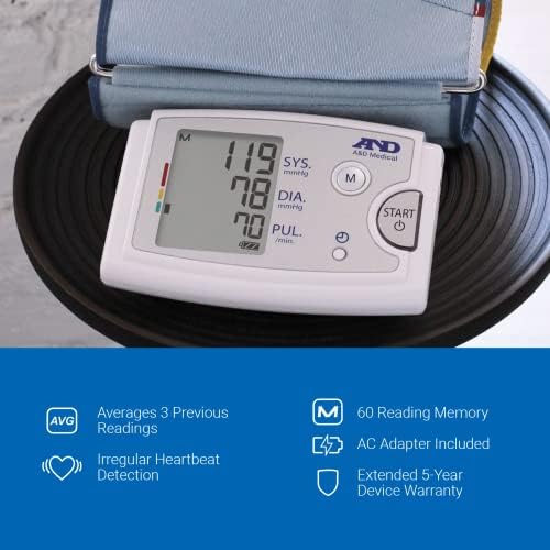 It’s Important to Know Your Numbers. Keeping a regular check on your blood pressure levels need not be a difficult task. A&D Medical PREMIUM+ Extra Large Cuff Upper Arm Blood Pressure Monitor is the easiest and most reliable way to keep track of your family’s health at home. The Extra Large cuff fits upper arms measuring between 16.5 – 23.6″ (42 – 60 cm) in circumference. This portable BP monitor measures your systolic and diastolic blood pressure and pulse rate. The results with clear numbers are displayed on the easy-to-read digital LCD screen. It can store and recall up to 60 readings. The cuff fit error message and the body movement sensor help prevent inaccurate measurements. AHA recommendations for taking your blood pressure are as follows: Sit quietly while taking your blood pressure. Rest for 5 to 10 minutes beforehand. Keep your legs uncrossed and feet flat. Sit with your back straight. Rest your arm on a table so the cuff is at heart level.
