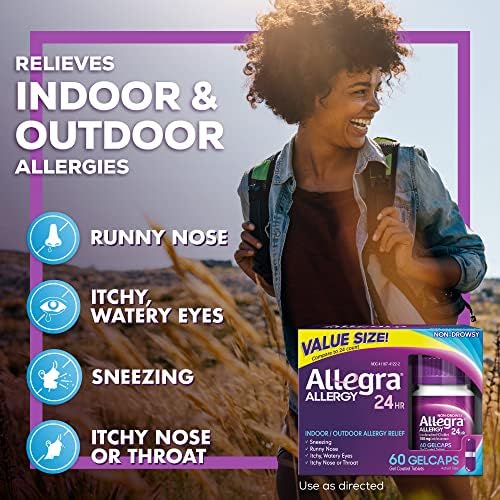 For your worst allergy symptoms, nothing works faster or stronger* than Allegra 24-Hour Adult Non-Drowsy Antihistamine Gelcaps. Allegra Gelcaps start working in one hour to give you round-the-clock relief from sneezing, runny nose, itchy and watery eyes, and itchy nose or throat. One pill is all you need for 24-hour relief. Formulated with active ingredient fexofenadine, Allegra Non-Drowsy Allergy Medicine provides powerful relief from indoor and outdoor allergies, including seasonal allergies and pet allergies. Be ready for spring allergies, fall allergies, dog allergies and more. Stock up on Allegra 24-Hour Non-Drowsy Gelcaps for fast*, effective allergy relief. With 60 gelcaps included, you get two months of allergy relief with one purchase. *Starts working in one hour; applies to first dose only. Among single-ingredient branded OTC oral antihistamines.