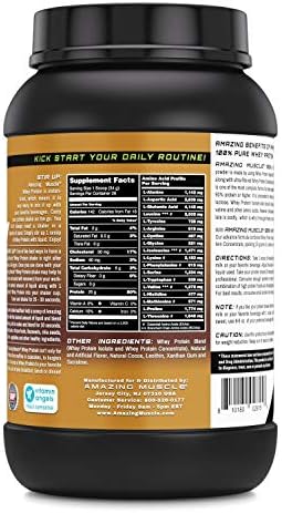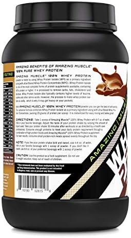 Protein is a vital nutrient in any healthy diet, but for athletes and fitness enthusiasts, it’s especially important. Without enough protein, your body can’t produce energy or develop lean muscle mass in response to exercise. Plus, a lack of protein can inhibit fat burning, making it harder to lose weight. The good news is that it’s easy to increase the amount of protein in your diet with Amazing Muscle 100% Whey Protein Powder! While there are many whey protein supplements on the market today, Amazing Muscle 100% Whey Protein Powder stands amongst the best because: ABSORBS FASTER. Our whey protein is low in lactose and fast absorbing. * HEART HEALTHY. Our whey protein isolate is low in cholesterol and fat and trans fat free. * SUGAR FREE. The whey is low in carbs, too! * TASTIER. You’ll love our whey protein powder Chocolate flavor! * INSTANTIZED. Our whey protein powder is instantized so it mixes easily in water, milk, juice or your favorite beverage to make a smooth, rich shake that’s never gritty or chalky. * STOCK UP & SAVE. Our 100% pure whey protein 2 lb tub is of great value. It contains 26 servings and can last upto 1 month. * HIGH QUALITY. All Amazing Muscle products are manufactured in the USA at a GMP certified facility to ensure purity. * CHOOSE THE BEST!! Order Amazing Muscle 100% Whey Protein Powder now.