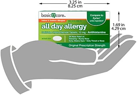 Compare to the active ingredient of Zyrtec; Don’t let allergies slow you down; Treat yourself to all day allergy relief with Amazon Basic Care All Day Allergy; Whether you’re indoors or outside, these allergy pills help treat common allergy symptoms such as sneezing, runny nose, itchy nose or throat and itchy, watery eyes. When used as directed, just one dose of Amazon Basic Care All Day Allergy works for a full 24 hours