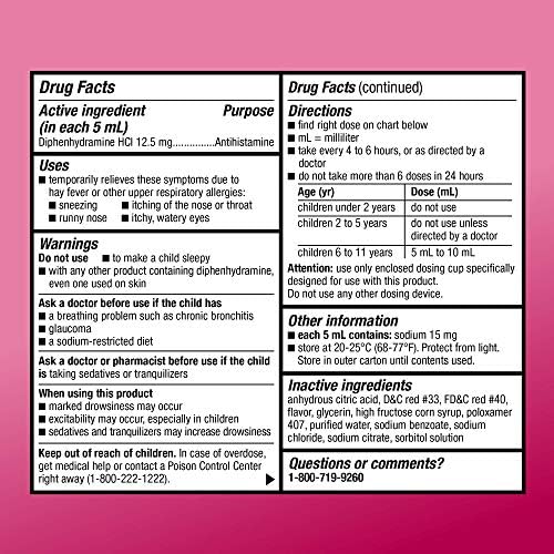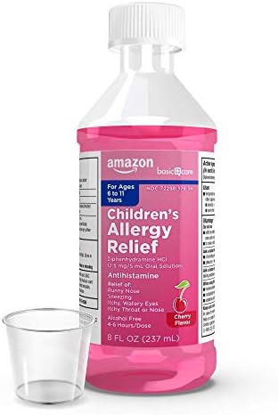 Compare to the active ingredient in Children’s Benadryl Allergy Liquid. Amazon Basic Care Children’s Complete Allergy Medicine provides 4-6 hours of multi-symptom relief for sneezing, runny nose, itchy throat or nose and itchy, watery eyes. Contains Diphenhydramine HCl 12.5 mg/5 mL, a powerful antihistamine that relieves symptoms of hay fever or other upper respiratory allergies. The cherry-flavored liquid blocks histamine to give your child multi-symptom relief from indoor and outdoor allergies. This allergy liquid medication is for children ages 6-11 years. Children’s allergy relief comes in a cherry flavor that kids will love. A convenient dosage cup is included. Take every four to six hours, or as directed by a doctor. Gluten and alcohol free.