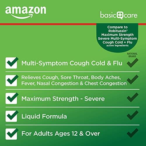 Compare to Robitussin Severe Multi-Symptom Cough Cold and Flu active ingredients. Get effective relief of cough, sore throat, body aches, fever, nasal congestion and chest congestion with Amazon Basic Care Tussin Severe Multi-Symptom Cough Cold and Flu CF MAX. This effective liquid cough syrup is non-drowsy and provides maximum strength mucus relief. It contains the powerful combination of Acetaminophen (Pain Reliever/Fever Reducer), Dextromethorphan HBr (Cough Suppressant), Guaifenesin (Expectorant) and Phenylephrine HCl (Nasal Decongestant) to fight your severe cough, cold and flu symptoms. For adults and children ages 12 and over. Maximum strength claim based on maximum levels of active ingredients per 4 hour dose. Dosage cup included. Non-drowsy, alcohol free and gluten free multi-symptom relief.