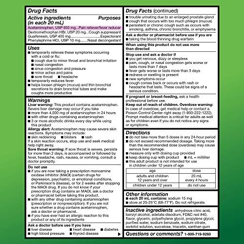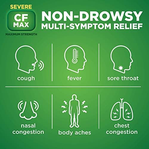 MAXIMUM STRENGTH: This cold medicine provides maximum strength relief of multiple cold and flu symptoms such as cough, nasal congestion, sinus congestion and pressure, minor aches and pains, sore throat, headache and temporarily reduces fever.