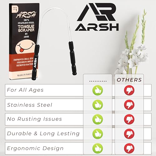 EASY GRIP HANDLE FOR SMOOTH CLEANSING: Designed ergonomically, the ARSH tongue scraper is designed to provide you the perfect grip for a smoother cleaning experience. Made in a U-shaped anti-gagging design, the tongue scraper has a wide smooth head that helps you clean your tongue comfortably with simple back and front motion.