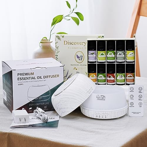 ASAKUKI Essential Oil Diffusers with 10Pcs*10ml Pure Essential Oil Gift Set, 5 in 1 Ultrasonic 300ML Aromatherapy Fragrant Oil Humidifier Vaporizer with Remote Control, Timer and Auto-Off-White