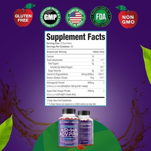 Made In USA | Non-GMO – Each bottle of our Ashwa Apple Cider Vinegar Pro Sugar Free Gummies with Vitamin D is made right here in the USA in a certified facility that follows all GMP standards. Rest assured you are getting the highest quality ashwaganda Vit D and apple cider vinegar supplements on the market, with no added chemicals, preservatives or potentially harmful “other ingredients.”
