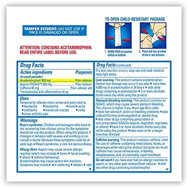 Max strength Pain relief powder that dissolves faster than pills and contains Acetaminophen, 500 mg, Aspirin, 500 mg (NSAID), Caffeine, 65 mg
