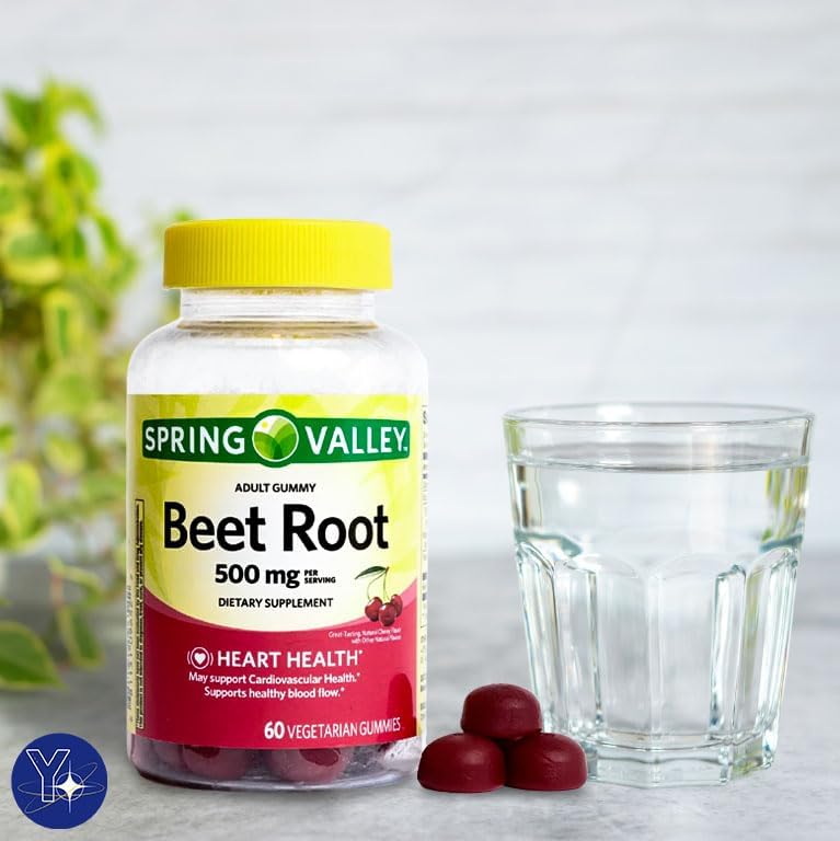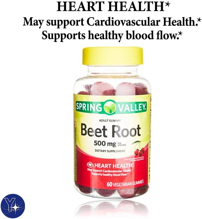 Spring Valley Beetroot Dietary Supplement Gummies, Cherry, Take control of your heart health with Spring Valley 500 mg Beetroot Vegetarian Gummies Dietary Supplements. These great-tasting gummies are flavored with natural cherry flavor and other natural flavors, and may support cardiovascular health and healthy blood flow. These gummies contain no gluten, egg, artificial flavors, artificial sweeteners, or corn syrup, and are 100% vegetarian. Each bottle contains 60 gummies; adults chew two gummies per day. Chew completely before swallowing. Take control of your heart health with Spring Valley 500 mg Beetroot Vegetarian Gummies Dietary Supplements.