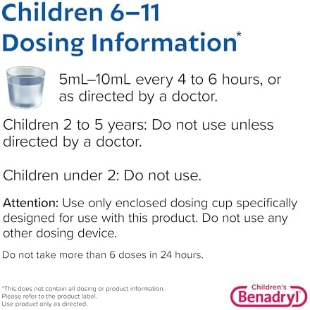 Children’s Benadryl Dye-Free Allergy Liquid Medicine in bubble gum flavor for allergy symptom reliefKids’ medicine temporarily relieves symptoms due to hay fever and other upper respiratory allergiesContains 12.5 mg diphenhydramine HCl per dose to alleviate your child’s allergy symptomsAntihistamine provides relief from runny nose; sneezing; and itchy eyes, nose and throatIntended for ages 6 to 11, Benadryl allergy medicine for kids is both alcohol-free and dye-freeThis allergy medication comes in a kid-friendly bubble gum flavor with a convenient dosing cupFormulated to be free of dyes, alcohol, sugar, parabens and high fructose corn syrupGet allergy relief from the brand moms turn to first when treating their children’s allergies