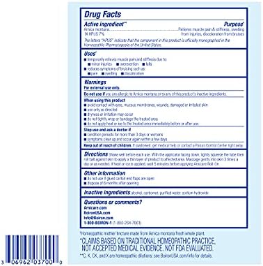 #1 Homeopathic Arnica Pain Reliever Muscle Pain & Stiffness Swelling from Injuries Bruises Massaging Roller Ball World Leader in Homeopathic Medicines Feel Better Faster 2 Handy Tubes for Home and On the Go Quickly Absorbed Arnica Plant-Based Relief From the French Mountains to You Boiron Arnicare Roll-On is made with one pure active ingredient: Arnica montana. This wild mountain daisy has been used for centuries to relieve muscle aches and bruises. Our Arnica is sustainably harvested by hand in the mountains of France. Within 48 hours, these freshly picked plants arrive at our laboratories to become one of the most widely used homeopathic medicines around the world. Carefully selected Laboratory tested Unsurpassed quality since 1932 We take care of it, it takes care of you. The Boiron Promise Your health deserves the greatest respect. That’s why we’re committed to your satisfaction. Uses Temporarily relieves muscle pain and stiffness due to: Minor injuries Overexertion Falls Reduces symptoms of bruising such as: Pain Swelling Discoloration