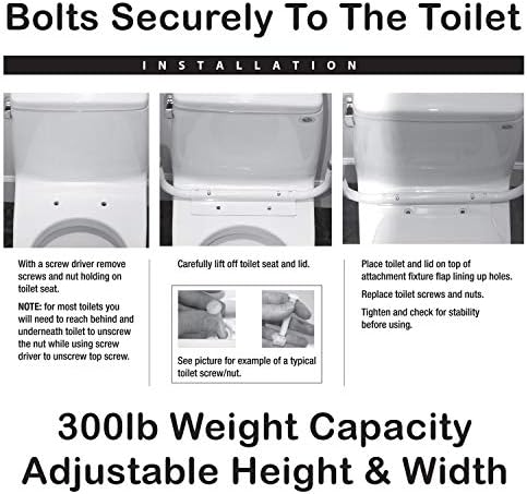 Carex Toilet Safety Rails – Toilet Safety Frame For Elderly, Handicap, or Disabled – Toilet Rails For Home Use Safely Sit and Stand at Your Toilet The Toilet Safety Frame features Hypalon cushion grips for added comfort and stability. This easy to assemble safety frame allows users to safely stand or sit at the toilet. The height is adjustable and the width adjusts from 18 to 20 inches to fit most toilets. This toilet safety frame will give added security while standing or sitting at the toilet. Features & Benefits: Supports weight capacity of 300 lbs. Adjustable height and width from 18″ to 20″ Product weighs 3 lbs. Safely stand or sit at the toilet