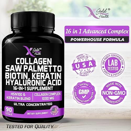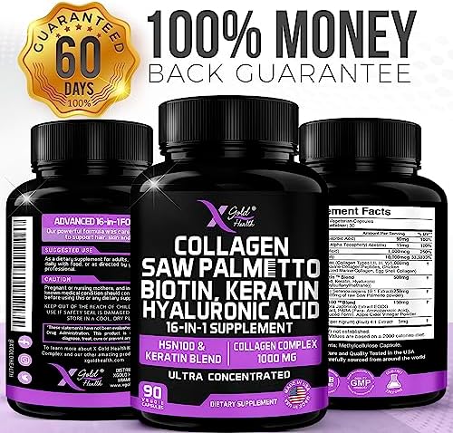 Collagen, Saw Palmetto, Biotin, Keratin, Keratin & Hyaluronic Acid – 16-in-1 Beauty Supplement with Vitamin C & E, Collagen Complex, Keratin Blend & HSN100 – Hair, Skin & Nail Growth – 90 Capsules
