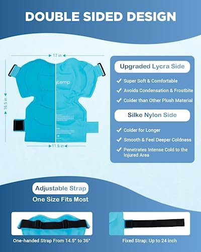 HUMANIZED DUAL-FABRIC DESIGN: The Comfytemp shoulder wrap around ice pack is designed with dual fabric to provide various level of coldness for targeted cold therapy. The upgraded skin-friendly soft lycra side delivers soothing cold and prevents frostbite, can be applied directly without extra wrapping. The silky nylon side penetrates intense cold to the injured shoulder. Start with the lycra side for adaption, then flip over to the nylon side for intensive & long-lasting relief and relaxation.