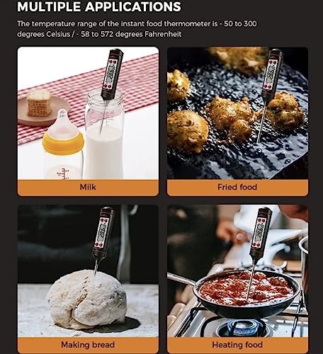MULTIPLE APPLICATIONS The temperature range of the instant food thermometer is – 50 to 300 degrees Celsius / – 58 to 572 degrees Fahrenheit