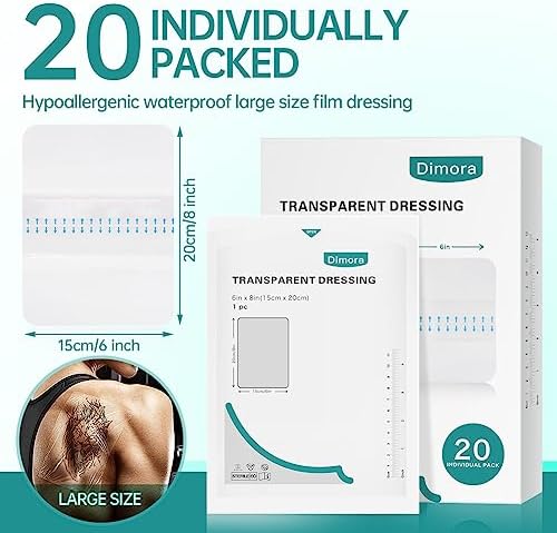 Dimora Transparent Film Dressing 6×8 inch 20 Packs with Hypoallergenic Adhesive, Large Waterproof Wound Bandages Post Surgical for Swimming, Tattoo Aftercare Bandage, IV Shield