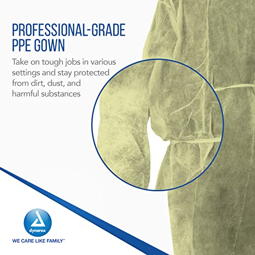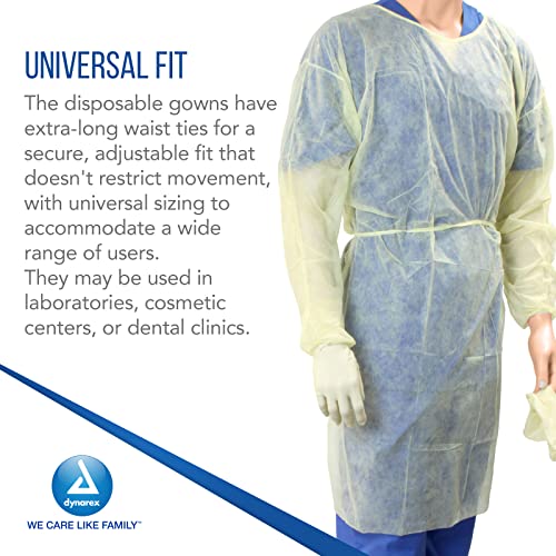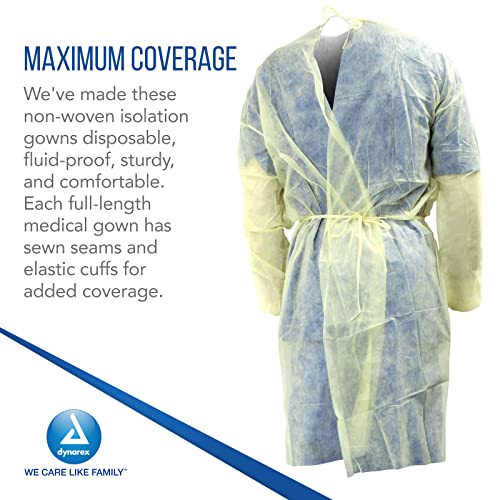 Dynarex Isolation Gowns – Full-Length, Max-Coverage Disposable Gowns – PPE Hospital Gown with Elastic Cuffs, Sewn Seams, Long Waist Ties, No Latex – Yellow, Large, 1 Case – 10 Bags of 5