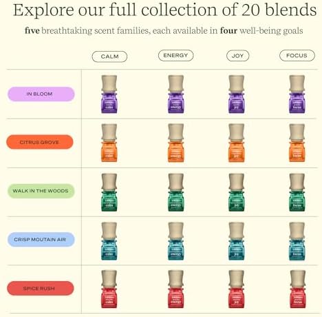 CREATE A UNIQUE SENSORY EXPERIENCE: Crisp Mountain Air blends are also available in Energy and Joy featuring peppermint, rosemary, and jasmine essential oils. Try the other scent families: In Bloom, Citrus Grove, Walk in the Woods, and Spice Rush with our collection of innovative aroma diffusers for home.