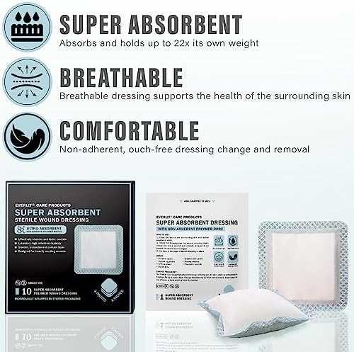 EVERLIT Super Absorbent Dressing for Wound Care | Nonstick Soft Surgical Gauze Pad for Heavily Exuding Wounds | Large Sterile Non-Adhesive Bandage for Fast Healing Wound Care | Pack of 10 (4″ x 4″)