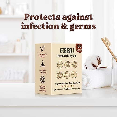 FEBU Eco-Friendly Organic Bamboo Fabric Bandages | Flexible and Gentle Latex Free Bandages | Natural Bandages for Scrapes, Cuts & First Aid | Fully Compostable | 50 Count Spot Bandages