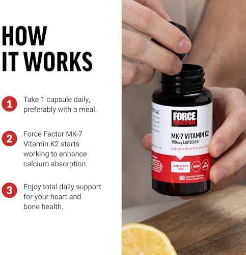 FORCE FACTOR MK-7 Vitamin K2 100mcg, Bone Support Supplements for Women and Men, Support Heart Health, Bone Density, and More, BIoavailable Form, Vegan, Non-GMO, 60 Vegetable Capsules