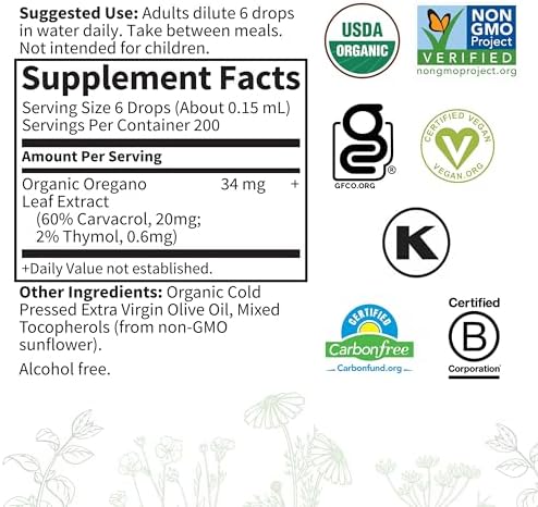 A LITTLE GOES A LONG WAY: A single serving delivers 34mg of Oregano Oil with 60% Carvacrol and 2% Thymol—simply dilute 6 drops in water; This Organic Oil delivers 200 servings per amber glass bottle and an easy-to-use dropper for your convenience