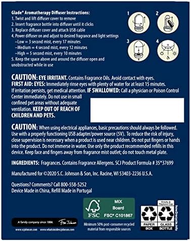 Relax the mood with the Glade Aromatherapy Cool Mist Diffuser. De-stress with a dual blend of essential oil-infused fragrance and enjoy the Choose Calm scent. This air diffuser uses fragrances infused with essential oils that are traced to their countries of origin. Own the mood with the blend of French Lavender and Australian Sandalwood. This aromatherapy diffuser features fragrances that are crafted for a life in balance, and they’re made without parabens, phthalates, nitro musks, artificial colors or dyes. Our scent diffuser is a treat for your senses. Match your light and fragrance mist settings to suit any mood. Play with different color options and brightness and fragrance levels. Just tap to change the mood with the easy-to-use controls. There’s no mixing or mess, as the one-click Glade mist refills are preblended and simple to insert into the device, while dual-wick technology ensures consistent performance for up to 60 days*. This home diffuser fits all USB power outlets including power banks and laptops so you can connect to your mood wherever you want. Inspire mindfulness with this Glade air freshener and take some time to relax and unwind. *on low setting