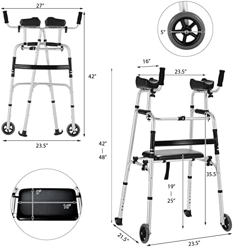 Adjustable Support Feet & Arm Rest: We have carefully designed 7-level height-adjustable support feet (ranging from 42″ to 48″) and 4-level adjustable double-arm rest, which can meet the needs of people of different heights. Our rehabilitation auxiliary walker can provide users with comfortable using experience and can be used indoors and outdoors.