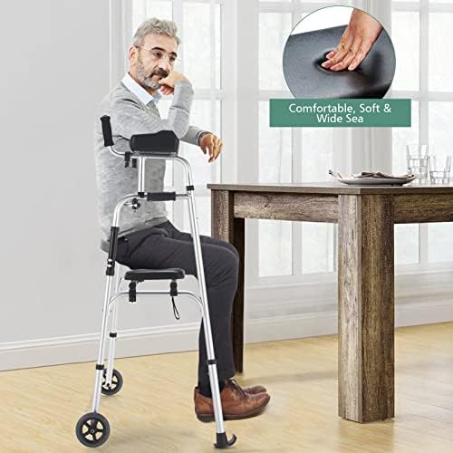Goplus Folding Walker for Seniors, Lightweight Standard Walker with 5’’ Wheels, Seat and Arm Rest Pad, Height Adjustable Platform Walker, Standing & Walking Mobility Aid for Elderly Handicap Disabled
