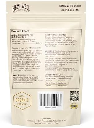 Hemp Well Thrive Cat Soft Chews, Everyday Supplement for Overall Health, Supports Hip, Joint, and Heart Health, Organically Sourced, 60 Count