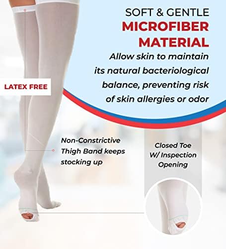 LIGHT COMPRESSION FOR INCREASED CIRCULATION – These Anti-Embolism Thigh Highs provide therapeutic level compression 18 mmHg that reduces patient’s risk of pulmonary embolism and blood clots. The light compression is designed for every day wear for the prevention and relief of minor to moderate varicose, and for relieve tired, aching legs, and minor swelling of feet, ankles, and legs.
