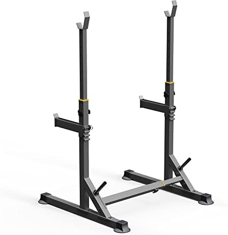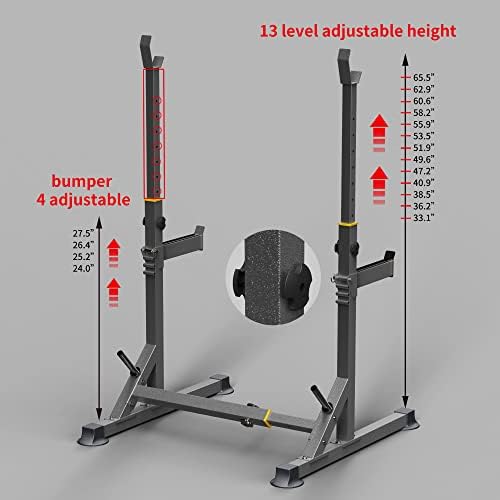 [4 POSITIONS ADJUSTABLE BUMPER] Squat Rack with adjustable bumper,easy to place the barbell when you need a short break or switch movements.Bumper: 24”to 27.5”. 4 Positions.