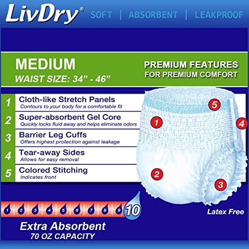✔ ADULT PROTECTIVE UNDERWEAR- LivDry Overnight Protection adult diapers for women and men who experience bladder leaks or loss of control. These super absorbent incontinence products are designed for maximum comfort and bedtime-to-rise reassurance.
