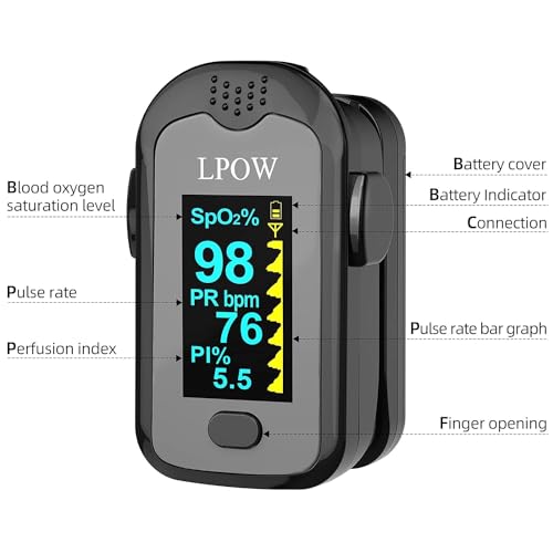 LPOW Fingertip Pulse Oximeter, Blood Oxygen Saturation Monitor (SpO2) with Pulse Rate, Perfusion Index with Alarm, OLED Display, Batteries and Lanyard Included