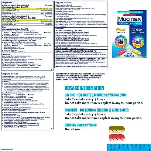 Maximum Strength Mucinex Fast-Max Day Cold & Flu & Nightshift Night Severe Cold & Flu Caplets combo pack is a Multi-Symptom Relief medicine and All-in-One solution for Cold & Flu symptoms. Day Time Caplets help reduce fever, relieve cough, chest, nasal & sinus congestion that can cause mucus buildup, sinus pressure, minor aches and pains, headache and sore throat. Night Time Caplets help reduce fever, relieve cough, nasal congestion that leads to stuffy nose, minor aches & pains, headache, sneezing, runny nose, sore & itchy throat and allegry symptoms. Mucinex is the #1 Cough & Cold Brand Doctors Trust* and #1 Pharmacist Recommended Brand† as well. This product contains 40 caplets – 24 Day Time and 16 Night Time caplets. It can be used by Adults and Children 12 years of age and over. KEY INGREDIENTS DAY TIME ACTIVE INGREDIENTS PER CAPLET: Contains Acetaminophen – Pain reliever and Fever reducer; Dextromethorphan HBr – Cough Suppressant; Guaifenesin – Expectorant; Phenylephrine HCI – Nasal Decongestant NIGHT TIME ACTIVE INGREDIENTS PER CAPLET: Contains Acetaminophen – Pain reliever; Dextromethorphan HBr – Cough Suppressant; Phenylephrine HCI – Nasal Decongestant; Triprolidine HCI – Antihistamine. Do not take the Maximum Strength Mucinex Fast-Max Day Cold & Flu & Nightshift Night Severe Cold & Flu Caplets at the same time. Always wait at least 4 hours before taking another dose of Mucinex caplets. Do not take more than a total of 12 caplets in any 24-hour period. Take only as directed. *IQVIA using ProVoice Survey, December 2022 †U.S. News & World Report/Pharmacy Times 2023-2024