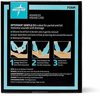 Medline Optifoam Gentle EX Bordered Foam Adhesive Dressing features a premium, 5-layer medical-grade dressing designed for advanced wound care. Super absorbent with a gentle touch and superior to drugstore bandages. Absorbent silicone-faced foam gently covers wound and helps reduce friction. Silicone adhesive border for easier repositioning and gentle removal with low-profile design. Flexible, conformable and comfortable with maximum 7-day wear time. Use as a primary or secondary dressing; for partial and full-thickness wounds with moderate drainage.