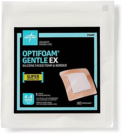 Medline Optifoam Gentle EX Bordered Foam Adhesive Dressing features a premium, 5-layer medical-grade dressing designed for advanced wound care. Super absorbent with a gentle touch and superior to drugstore bandages. Absorbent silicone-faced foam gently covers wound and helps reduce friction. Silicone adhesive border for easier repositioning and gentle removal with low-profile design. Flexible, conformable and comfortable with maximum 7-day wear time. Use as a primary or secondary dressing; for partial and full-thickness wounds with moderate drainage.