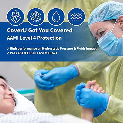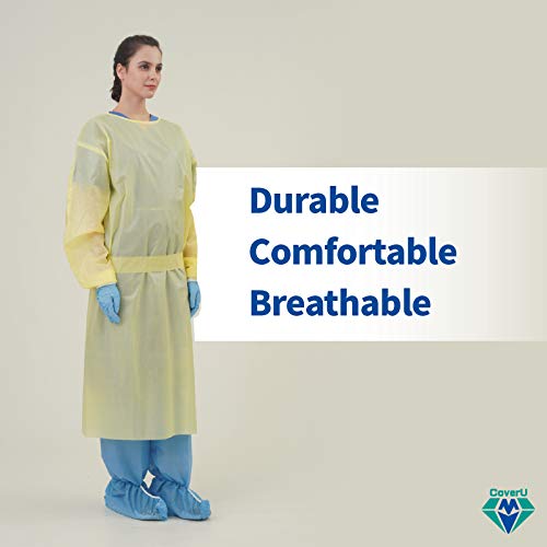 Medtecs Disposable Isolation Gowns – AAMI Level 4 PPSB+PE 36 GSM – 10/100 PC – Seal Tape & Elast Cuffs, Fluid Resistant Durable Comfortable PPE – CoverU Series, Unisex Adult | Yellow, 100 PC