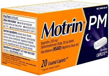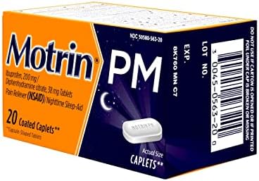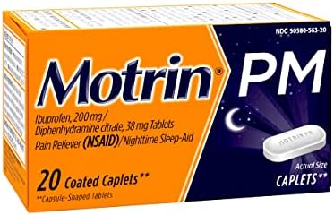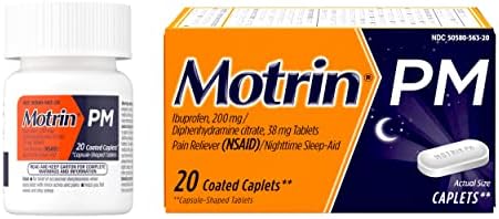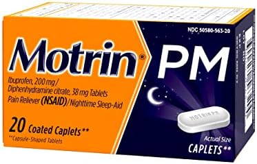 Ease today’s aches and get the sleep you need for tomorrow with Motrin PM caplets. Motrin PM provides relief from occasional sleeplessness when associated with minor aches and pains. Combining 200 milligrams of ibuprofen with 38 milligrams of diphenhydramine citrate, Motrin PM provides pain relief with a nighttime sleep-aid to help you fall asleep. This site contains current product information and may differ from the information on the product packaging you may have.