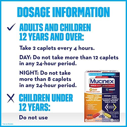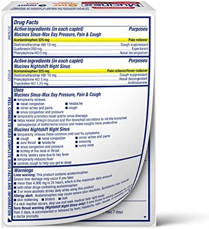 Maximum Strength Mucinex Sinus-Max (Day) Pressure, Pain & Cough & Nightshift (Night) Sinus Caplets is an OTC medicine for relief of your Multi-symptom Sinus Relief. Maximum Strength Mucinex Sinus-Max Day Pressure, Pain & Cough Caplets help to relieve pain, sinus pressure & congestion, headaches, controls cough and thins & loosens mucus. Maximum Strength Mucinex Nightshift (Night) Sinus Caplets help to relieve pain, cough, reduce fever, sore throat, runny nose, sneezing & nasal congestion. Nighttime relief for a better morning!. Mucinex is the #1 Cough & Cold Brand Doctors Trust*. This product contains 20 Caplets (12 Day + 8 Night). It can be used by Adults and Children 12 years of age and over. Mucinex Sinus-Max Day Pressure, Pain & Cough contains Acetaminophen – Pain reliever; Dextromethorphan HBr – Cough Suppressant; Guaifenesin – Expectorant; Phenylephrine HCI – Nasal Decongestant. Mucinex Nightshift Sinus contains Acetaminophen – Pain reliever and Fever reducer; Dextromethorphan HBr – Cough Suppressant; Phenylephrine HCI – Nasal Decongestant; Triprolidine HCI – Antihistamine. Do not take the Mucinex Sinus-Max Pressure, Pain & Cough & Nightshift Sinus Caplets at the same time. Always wait at least 4 hours before taking another dose of Mucinex caplets. Take only as Directed *IQVIA using ProVoice Survey, December 2021