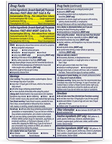 Maximum Strength Mucinex Sinus-Max Day and Night is an OTC medicine for relief of your Multi-symptom Sinus Relief. Maximum Strength Mucinex Sinus- Max Day helps relieve pain, sinus pressure, headache, cough, congestion, thins & loosens mucus and chest congestion. Maximum Strength Mucinex Sinus- Max Night helps relieve pain, sinus pressure, nasal congestion, cough, and runny nose & sneezing. Mucinex is the #1 Cold and Cough brand doctors trust*. This product contains 24 Fast Dissolving Liquid Gels (16 Day + 8 Night). It can be used by Adults and Children 12 years of age and over. SINUS SYMPTOMS RELIEVED DAY SYMPTOMS RELIEVED: Maximum Strength Mucinex Sinus-Max Day helps relieve pain, sinus pressure, headache, cough, congestion, thins & loosens mucus and chest congestion NIGHT SYMPTOMS RELIEVED: Maximum Strength Mucinex Sinus-Max Night helps relieve pain, sinus pressure, nasal congestion, cough, and runny nose & sneezing KEY INGREDIENTS MUCINEX SINUS-MAX DAY ACTIVE INGREDIENTS: Contains Acetaminophen for pain relief, Dextromethorphan HBr for cough suppression, Guaifenesin as an expectorant and Phenylephrine HCl for nasal decongestion MUCINEX SINUS-MAX NIGHT ACTIVE INGREDIENTS: Contains Acetaminophen for pain relief, Dextromethorphan HBr for cough suppression, Doxylamine Succinate as an Antihistamine and Phenylephrine HCl for nasal decongestion Do not take the Mucinex Sinus-Max Day and Night liquid gels at the same time. Always wait at least 4 hours before taking another dose of Mucinex liquid gels. Take only as directed. *IQVIA using ProVoice Survey, December 2022
