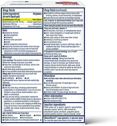 Maximum Strength Mucinex Sinus-Max Pressure, Pain & Cough is an OTC medicine for relief of your Nasal and Chest Congestion symptoms. Maximum Strength Mucinex Sinus-Max Pressure, Pain & Cough helps relieve cough, stuffy nose, chest & nasal congestion, headache and minor aches and pains. Mucinex is the #1 Cough & Cold Brand Doctors Trust*. This product contains 16 Fast Dissolving Liquid Gels. It can be used by Adults and Children 12 years of age and over. SYMPTOMS RELIEVED: Maximum Strength Mucinex Sinus-Max Pressure, Pain & Cough helps relieve cough, stuffy nose, chest & nasal congestion, headache and minor aches and pains ACTIVE INGREDIENTS: Contains Acetaminophen – pain reliever; Dextromethorphan HBr – cough suppressant; Guaifenesin – expectorant; Phenylephrine HCI – nasal decongestant Take only as Directed *IQVIA, ProVoice Survey, December 2021