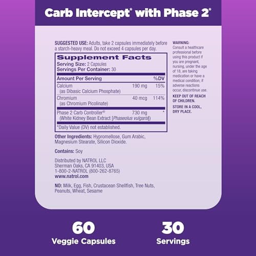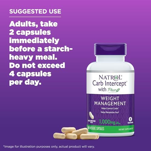 Natrol Carb Intercept with Phase 2 Carb Controller Capsules, White Kidney Bean Extract, Helps Control Carbs, Helps Metabolize Fats, Clinically Tested, Promotes Healthy Body Weight, 1,000mg, 60 Count
