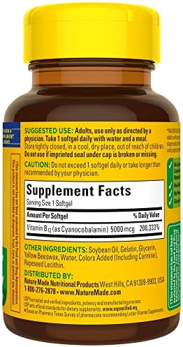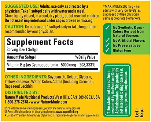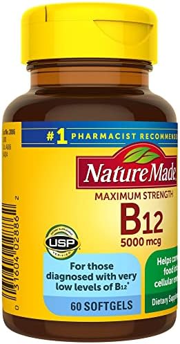 Nature Made Maximum Strength Vitamin B12 provides 5000 mcg of Vitamin B12, which helps break down food into energy that your body can use all day long. This gluten free B12 supplement has no artificial flavors, no synthetic dyes, and no preservatives. Nature Made B12 5000 mcg is a dietary supplement that also offers nervous system support and energy metabolism support(1). B12 vitamins are important for vegetarians and vegans who may not consume enough from their diet alone. These Maximum Strength Nature Made B12 Softgels help restore healthy levels of B12 in adults diagnosed with very low levels of B12(2). Adults, use only as directed by a physician and take one of these Vitamin B12 softgels daily with water and a meal. Nature Made supplements are quality you can trust. USP has tested and verified ingredients, potency and manufacturing process. USP sets official standards for dietary supplements. Visit the USP verified website for more information. (1)Helps convert food into cellular energy. (2)For adults with very low levels, as diagnosed by their physician using appropriate biomarkers. *Based on a survey of pharmacists who recommend branded vitamins and supplements.