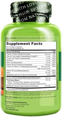 NATURELO Whole Food Brain Blend Supplement, Helps Support Memory, Focus and Mood – 60 Vegetarian Capsules