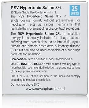 RSV Hypertonic Saline 3% For use as diluents in inhalators and nasal hygiene. Complies with the 2011 professional guideline of Israeli organizations of babies and children's health 25 Sterile Single Use Containers of 5mL Preservative Free Acute bronchiolitis, a viral disease usually common in infants and occurs mainly in winter. Treatment of the disease is primarily supportive and based on maintaining hydration and oxygen supplementation when needed. In recent years quite a number of studies around the world, proved the effectiveness of treatment with Hypertonic saline inhalation in infants hospitalized suffering from acute bronchiolitis. Hypertonic saline inhalation therapy resulted in clinical improvement and shortening the duration of hospitalization. Hypertonic saline works by raising fluid lining in the airway walls, reducing the edema layer of the sub-mucosa, improving Rheological properties of sputum and acceleration of the mucus clearance ( MC). Recommended use: For respiratory use with inhalators in cases of bronchiolitis- RSV infections: The inhalation of RSV hypertonic saline 7% should be given in a volume of 4 ml, three to six times a day. In light cases, Dose can be reduced to 0-3 ml volume of liquid inhaled. Bronchodilators can be added. Such treatment can be administered at home, clinic or emergency rooms. As nasal hygiene: Apply as needed