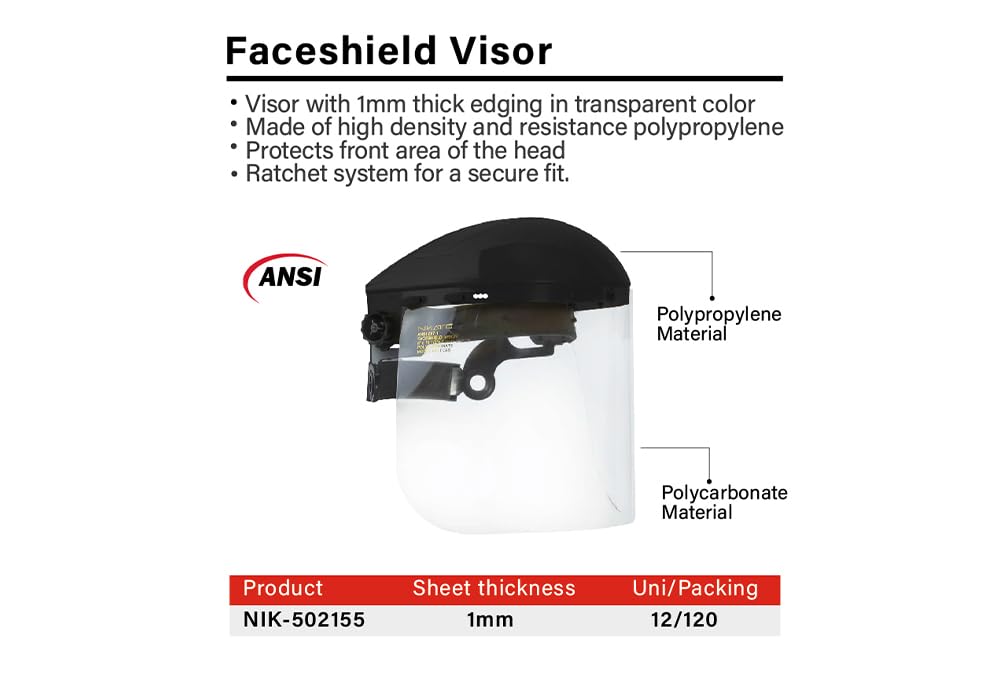 NIKATTO Safety Face Shield Visor with 1mm Thick Edging/Protects Front of Head/Ratchet System for Secure Fit/Made with High Density and Resistance Polypropylene