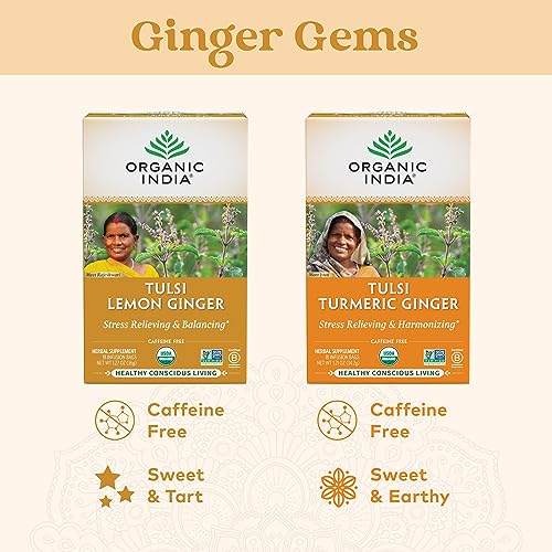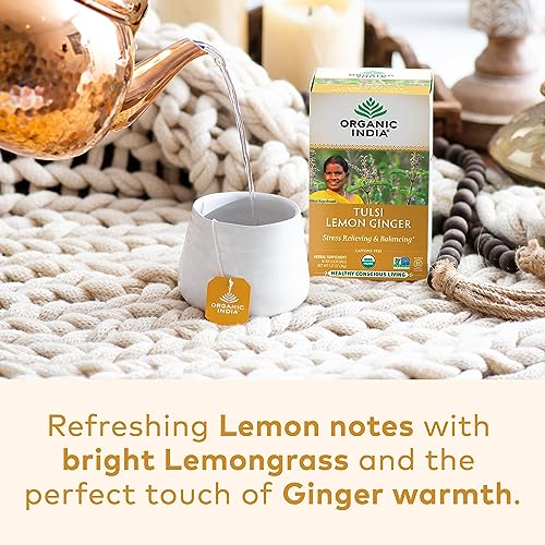 Organic India Tulsi Lemon Ginger Herbal Tea – Stress Relieving & Reviving, Immune Support, Aids Digestion, Vegan, USDA Certified Organic, Non-GMO, Caffeine-Free – 18 Infusion Bags, 6 Pack