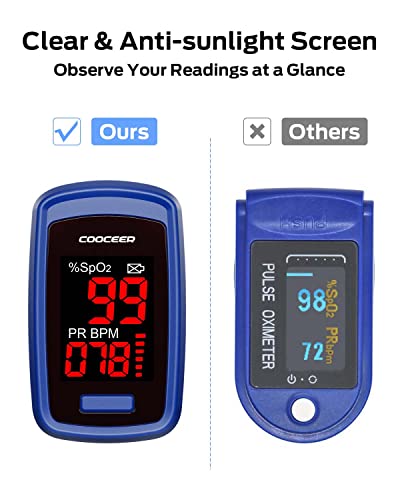 ❤【EASIER TO USE & READ】COOCEER spo2 pulse oximeter owns convenient one-button operation. Improved battery holder with optimal installation method, avoids damage and loss of accuracy due to incorrect battery installation. This fingertip pulse oximeter improved the large LED display, 20% larger than other finger oxygen monitor with eye-catching large RED font. Elderly, nearsighted can also accurate read in dark and under strong sunlight. Accurate read at a glance without inaccuracy.